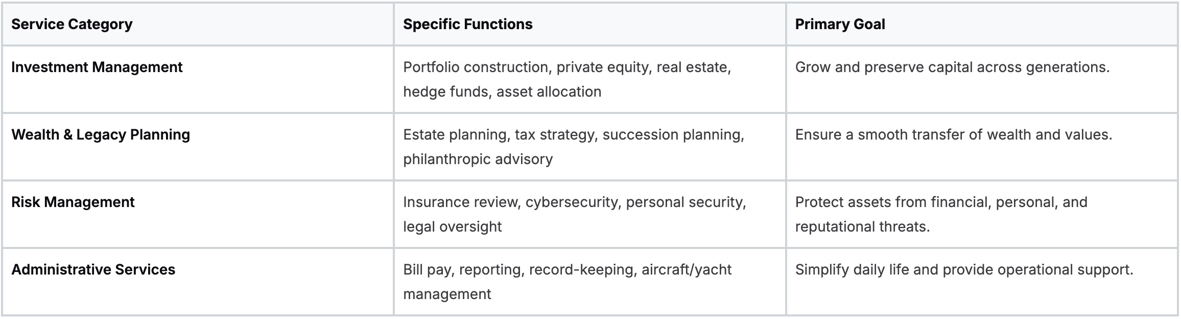 A family office does more than manage money; it manages complexity. By integrating investment, tax, legal, and personal services, it simplifies the financial lives of its clients and provides them with the clarity needed to make impactful decisions.
